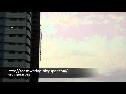 We was on vacation in Manila (Philippines) and we stayed in a Hotel (Cherry Blossoms Hotel) in Malate,Metro Manila.In the evening of June 27. I looked out of the hotel Window in the 4th floor and saw an Object hovering in the Sky beside of a condominium Building.The object was spinning around while completely still hovering maybe around 100 meter high.It moved after several minutes slowly to the right,then stopped again and moved slowly to the left and flies behind the building.It crossed the whole building and came out on the left side of the building.Then it was flying staight and slow out of our sight.In the pictures and the video it seems not to spin,but when we looked at it while taking pictures its clear to see that it spins around.We are sure,that no Plane,Balloon or Helicopter was at that time in that area.